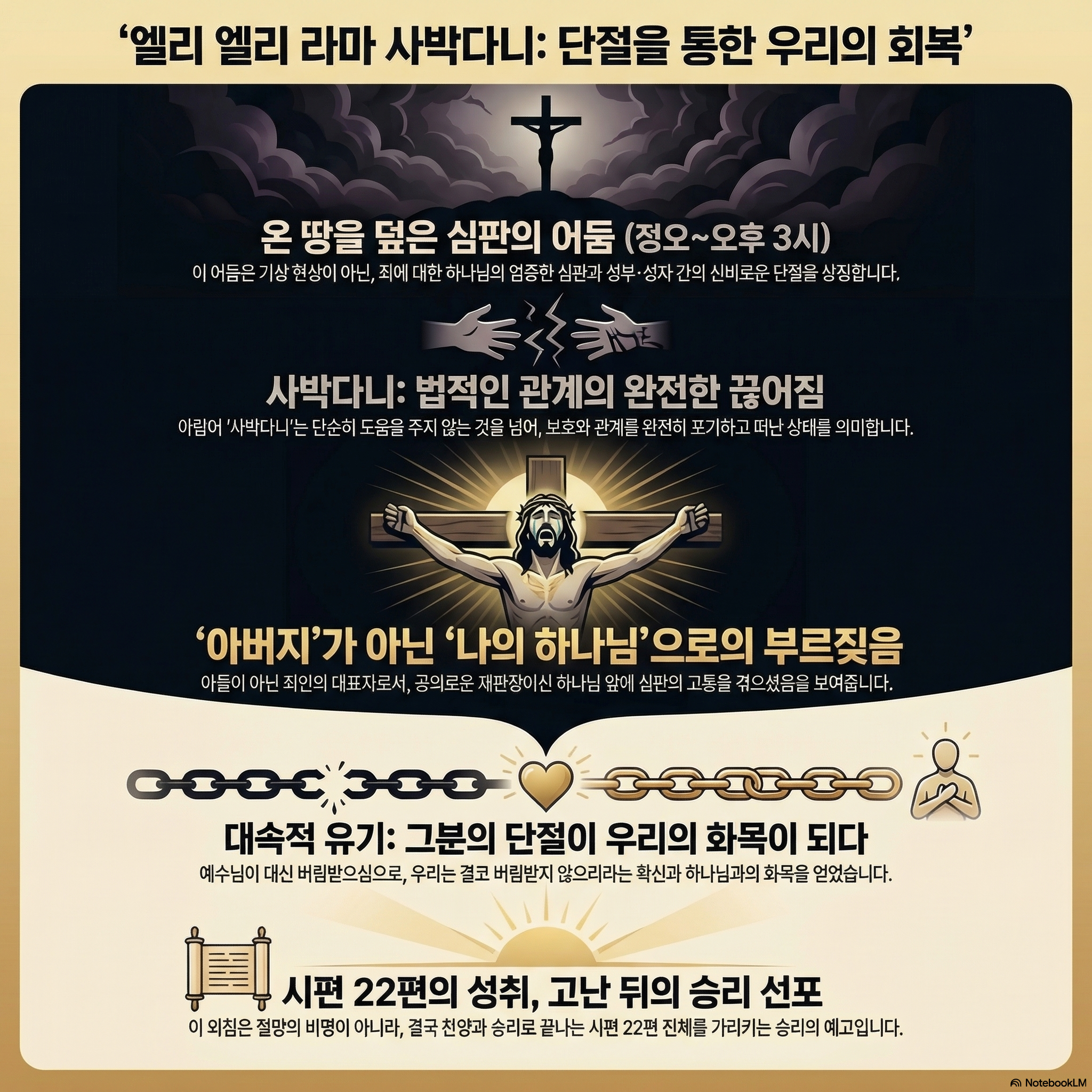 - 시편 22편의 성취: 이 말씀은 절망의 비명이 아니라 시편 22편 1절의 인용입니다. 유대인들은 시편의 첫 구절을 들으면 그 시 전체를 떠올렸습니다. 고난으로 시작하여 결국 승리와 찬양으로 끝나는 시편 22편을 인용하심으로, 예수님은 이 고통이 결국 하나님의 승리로 끝날 것임을 선포하신 것입니다.