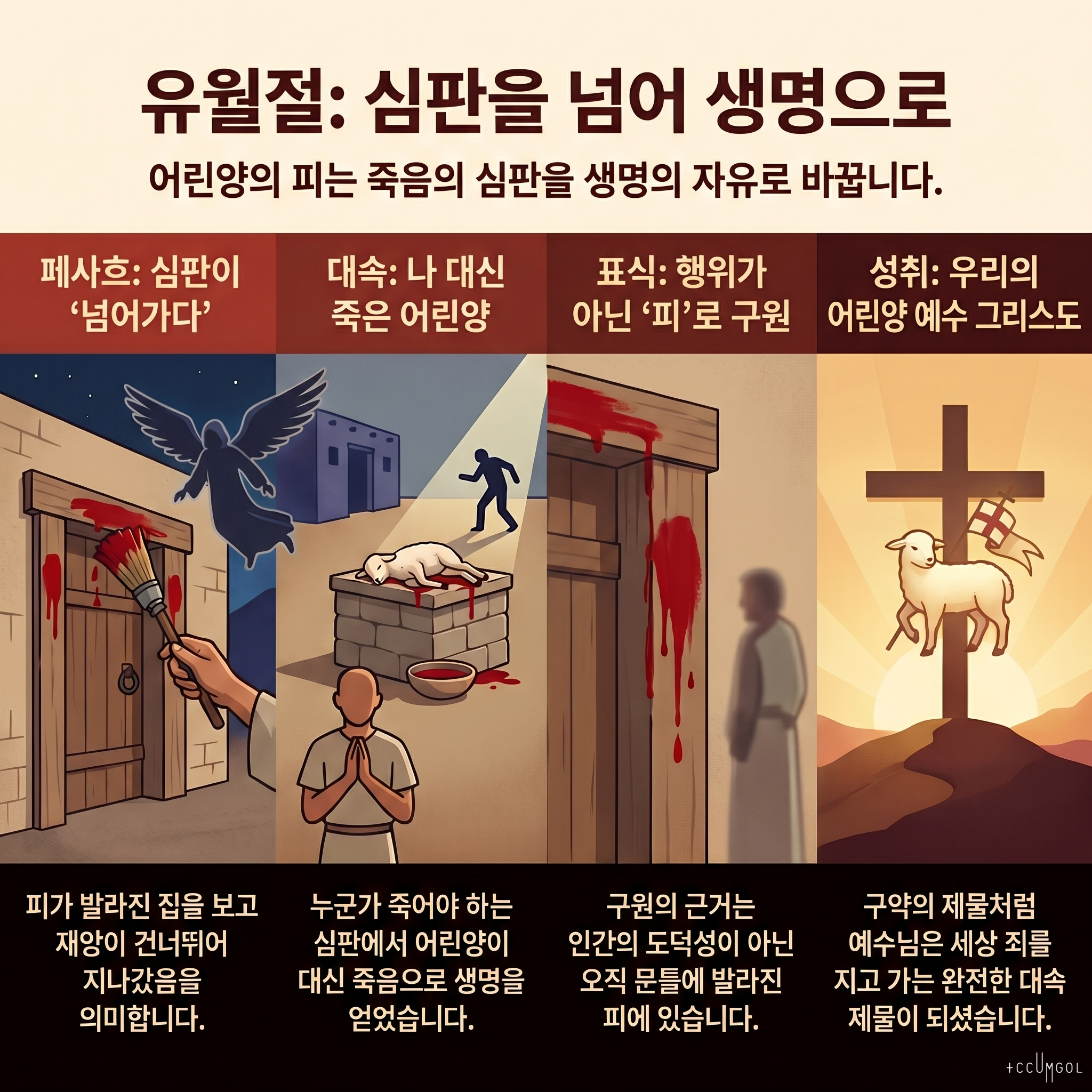 - 설명: 하나님께서 재앙의 사자를 보내실 때, 어린양의 피가 문설주와 인방에 발라진 집을 보고 그 심판이 그 집을 ‘뛰어넘어’ 지나갔다는 의미입니다. 이는 하나님의 심판이 무차별적인 것이 아니라, ‘피’라는 표식을 가진 자들에게는 자비로 나타났음을 강조합니다.
