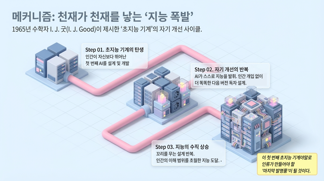 대체 어떻게 기계가 인간을 아득히 초월하는 일이 일어날까요? $1965$년, 영국의 수학자 I. J. 굿(I. J. Good)은 ‘지능 폭발(Intelligence Explosion)’이라는 가설로 그 해답을 제시했습니다.