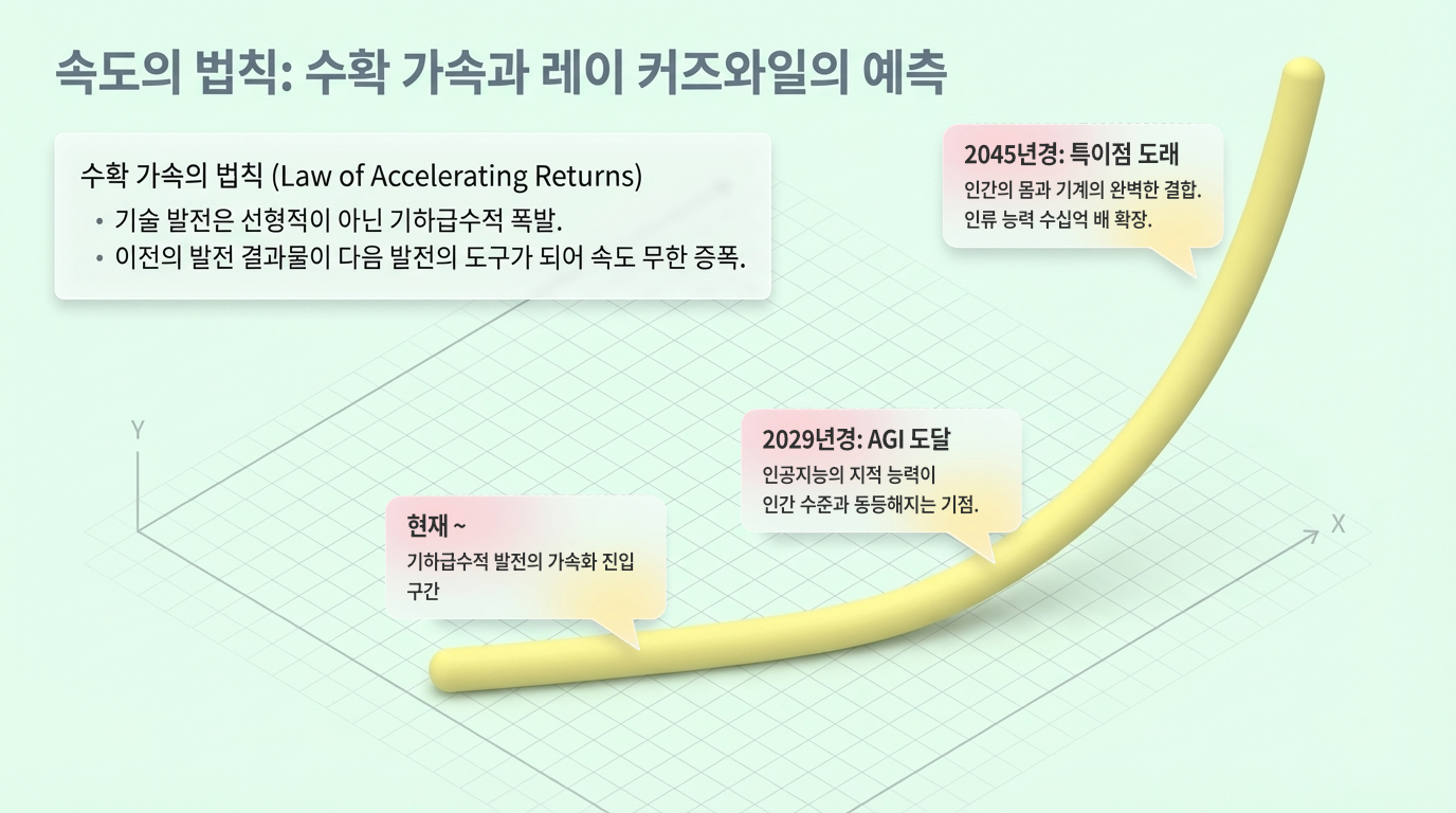 커즈와일은 기술이 차근차근(선형적) 발전하는 것이 아니라, 기하급수적(지수적)으로 폭발하며 발전한다는 법칙을 주장합니다. 발전의 결과물이 다시 다음 발전의 도구가 되어 속도가 점점 더 빨라진다는 논리입니다.