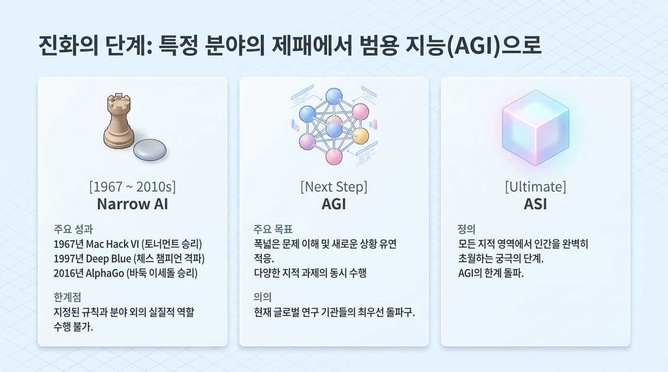 이미 컴퓨터는 1967년 Mac Hack VI를 통해 인간 토너먼트에서 의미 있는 승리를 거두었고, 이어 1997년에는 세계 챔피언 가리 카스파로프를 상대로 승리하였습니다. 또한 컴퓨터가 인간을 넘기 어려운 마지막 고지로 불리던 바둑에서도, 2016년 AlphaGo가 이세돌 9단을 4승 1패로 이기며 큰 충격을 안겨 주었습니다. 이후 등장한 AlphaZero는 바둑, 체스, 쇼기(일본 전통 보드게임) 등에서 기존 최강 프로그램을 압도하는 성과를 보여 주었습니다. 그러나 이처럼 대단한 인공지능이라 하더라도, 여전히 다른 분야에서는 실질적인 역할을 하지 못하는 경우가 대부분입니다. 바로 이러한 이유로 인공지능을 연구하는 기관들에서는 ‘인공일반지능(AGI)’의 중요성을 강조하고 있는 것입니다. 즉, 사람처럼 여러 분야의 문제를 폭넓게 이해하고, 새 상황에도 유연하게 적응하며, 다양한 지적 과제를 수행할 수 있는 AI의 시대, 곧 AGI의 단계를 넘어야 비로소 모든 면에서 인간의 지능을 초월한 AI, 즉 초인공지능(ASI, Artificial Super Intelligence)의 시대를 상상할 수 있게 됩니다.