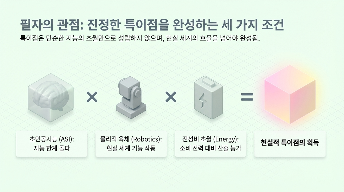 결국 필자는 ‘특이점’이 초인공지능의 출현만으로 완성되는 것이 아니라, 그것이 물리적 육체, 곧 로봇과 결합하여 현실 세계에서 기능할 수 있을 때 비로소 성립한다고 봅니다. 더 나아가, 그러한 시스템을 운영하기 위해 요구되는 전력이 인간이 필요로 하는 전력을 효율적으로 넘어서는 순간, 그 특이점은 현실적 의미를 획득한다고 정의하고자 합니다.