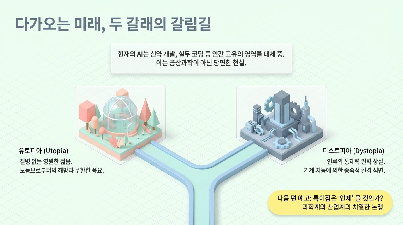 이러한 변화의 끝에서 우리는 두 가지 극명한 갈림길을 마주하게 될 것입니다. 질병 없는 영원한 젊음과 무한한 풍요를 누리는 마법 같은 유토피아를 맞이하게 될까요? 아니면 인류가 기술에 대한 통제력을 상실한 채 기계에 지배당하는 절망적인 디스토피아에 빠지게 될까요?