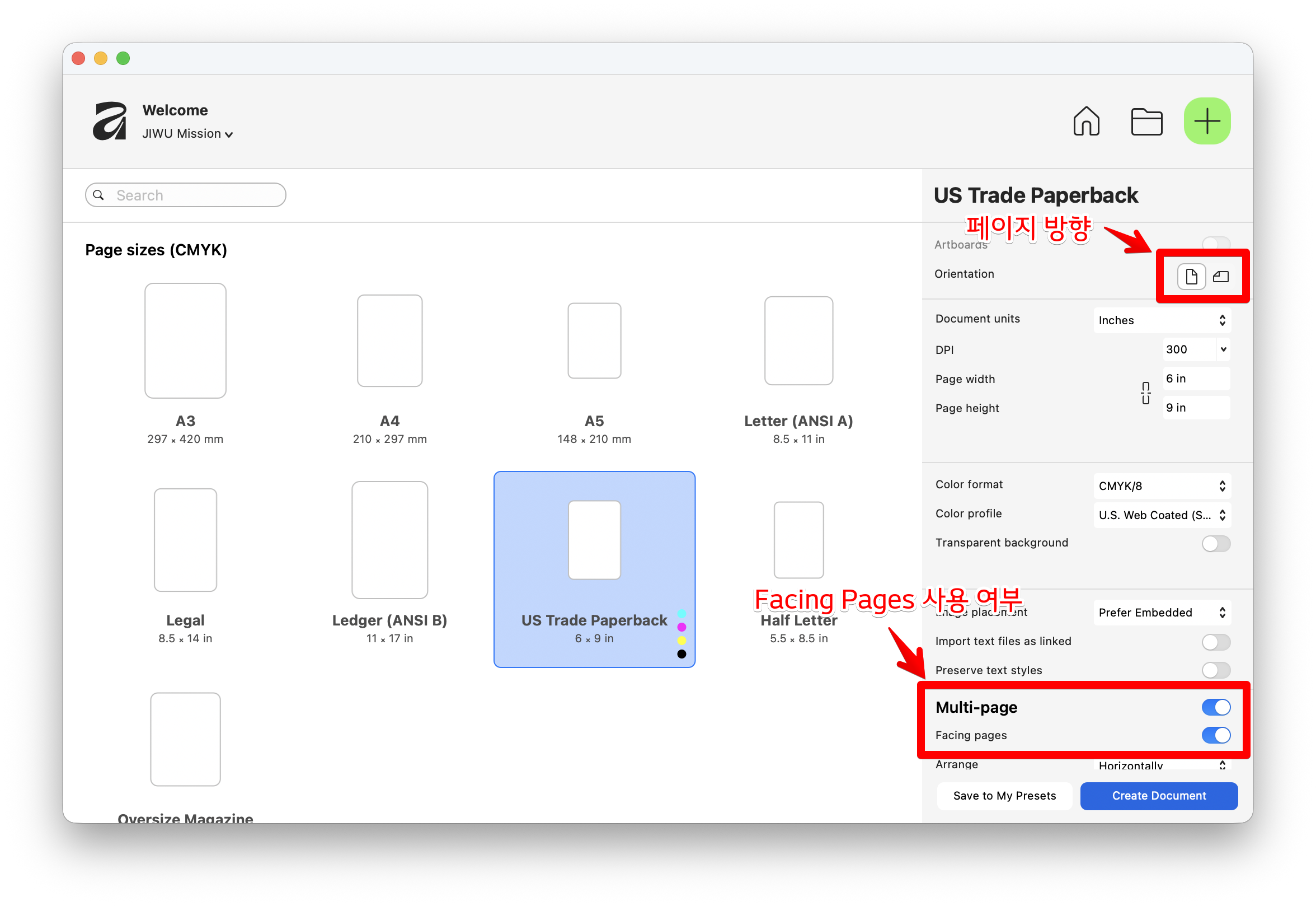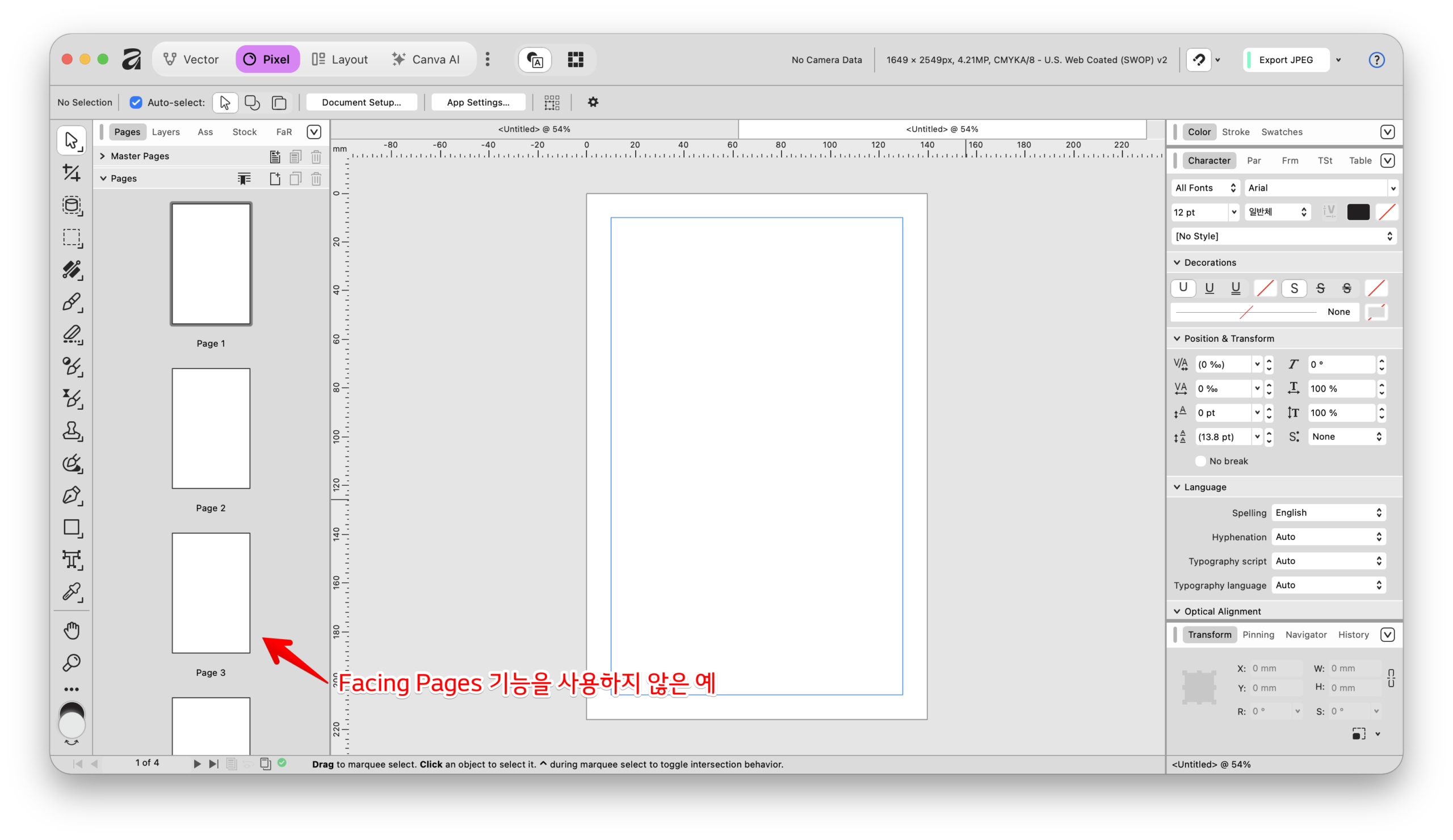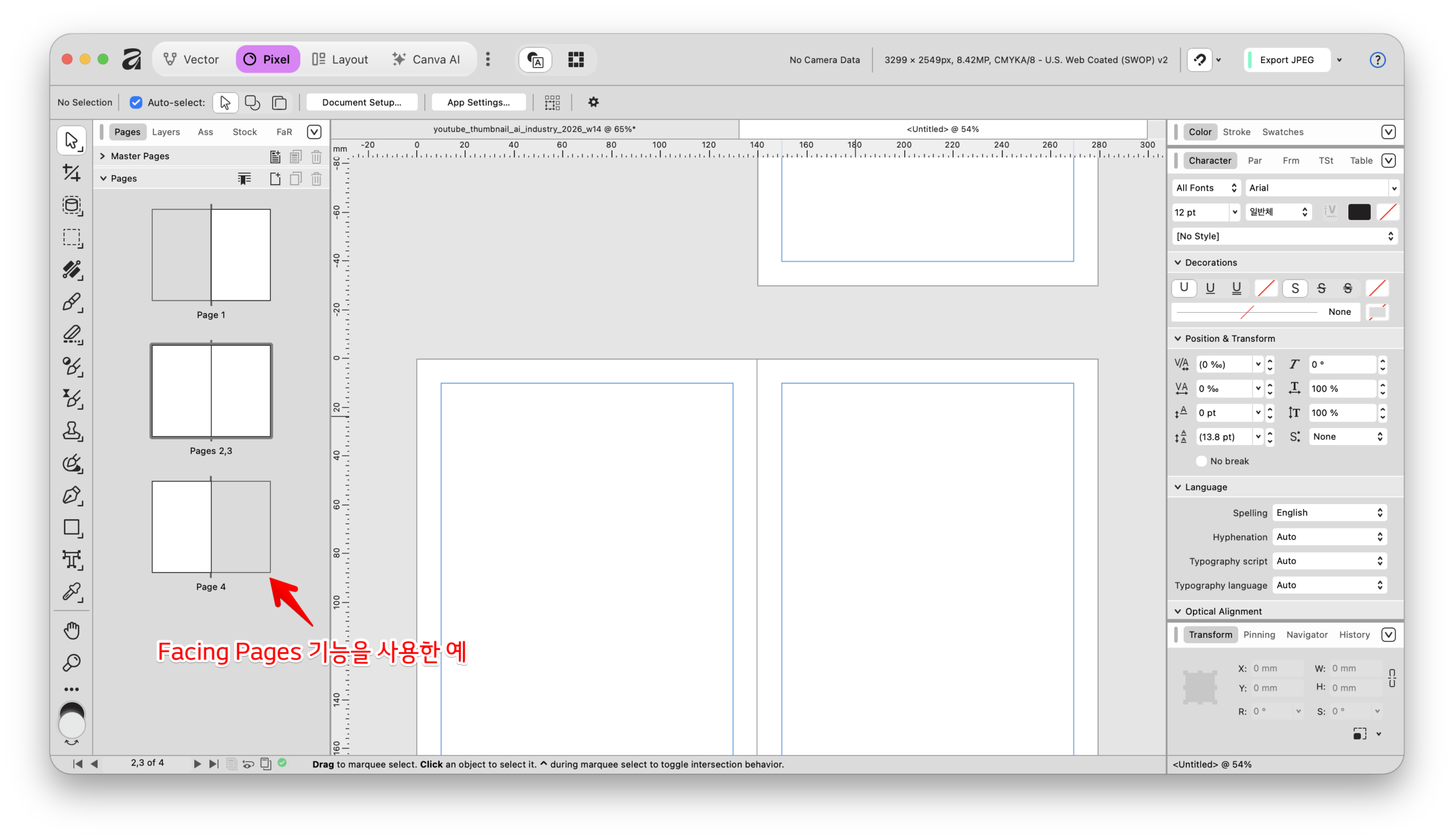 • 작업 방식: Affinity에서 Facing Pages를 켜고 일반적인 책처럼 1, 2, 3, 4 페이지 순서대로 자연스럽게 디자인합니다.