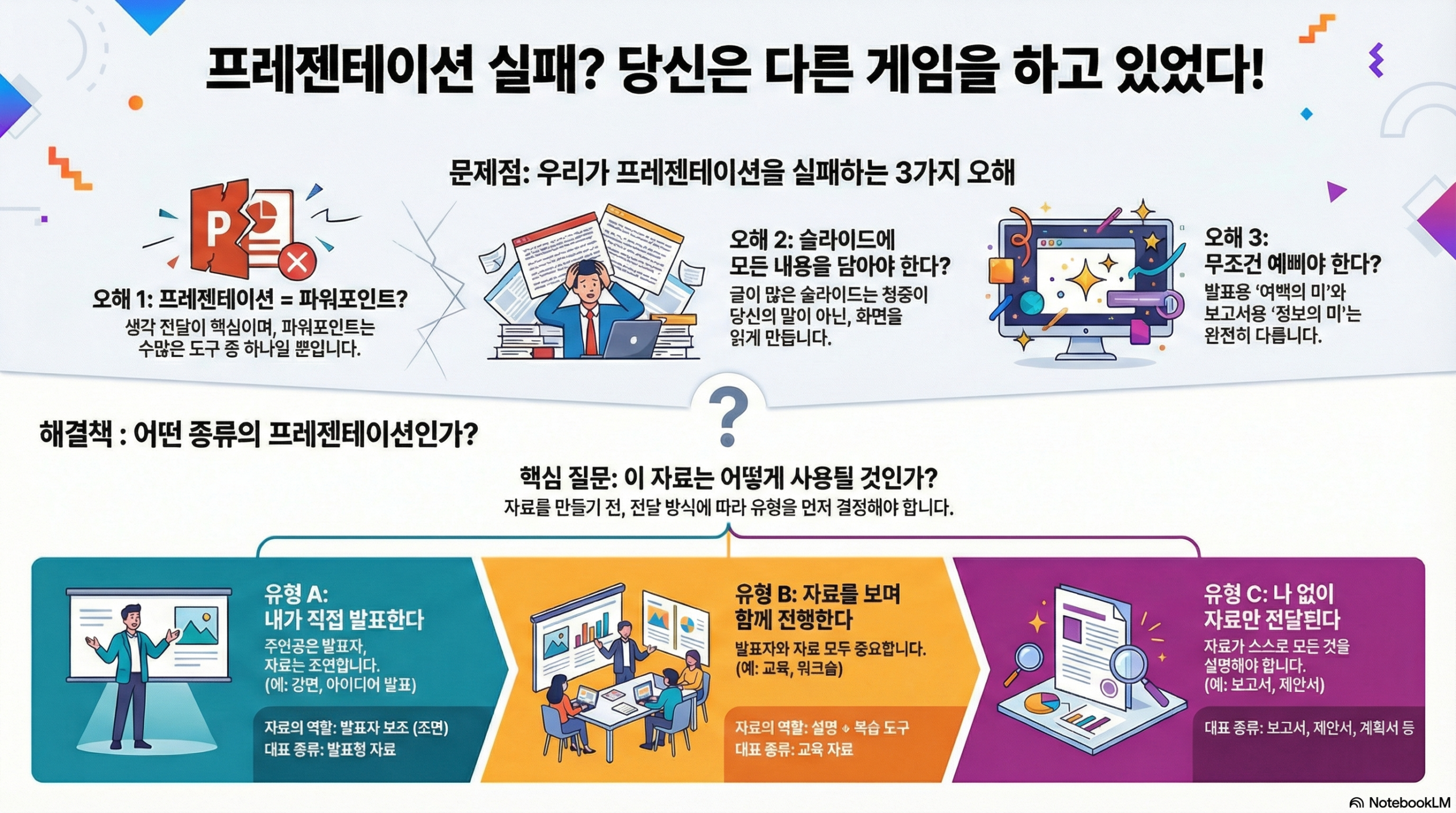 다만 중요한 점이 있습니다. ‘슬라이드를 적게’가 항상 정답은 아닙니다. 어떤 상황은 발표자가 직접 말로 이끌어야 하고(발표형), 어떤 상황은 자료 자체가 혼자 읽혀야 합니다(문서형). 그런데 우리는 이 둘을 구분하지 않고 한 가지 방식만 쓰려 합니다. 여기서 대부분의 실패가 시작됩니다.