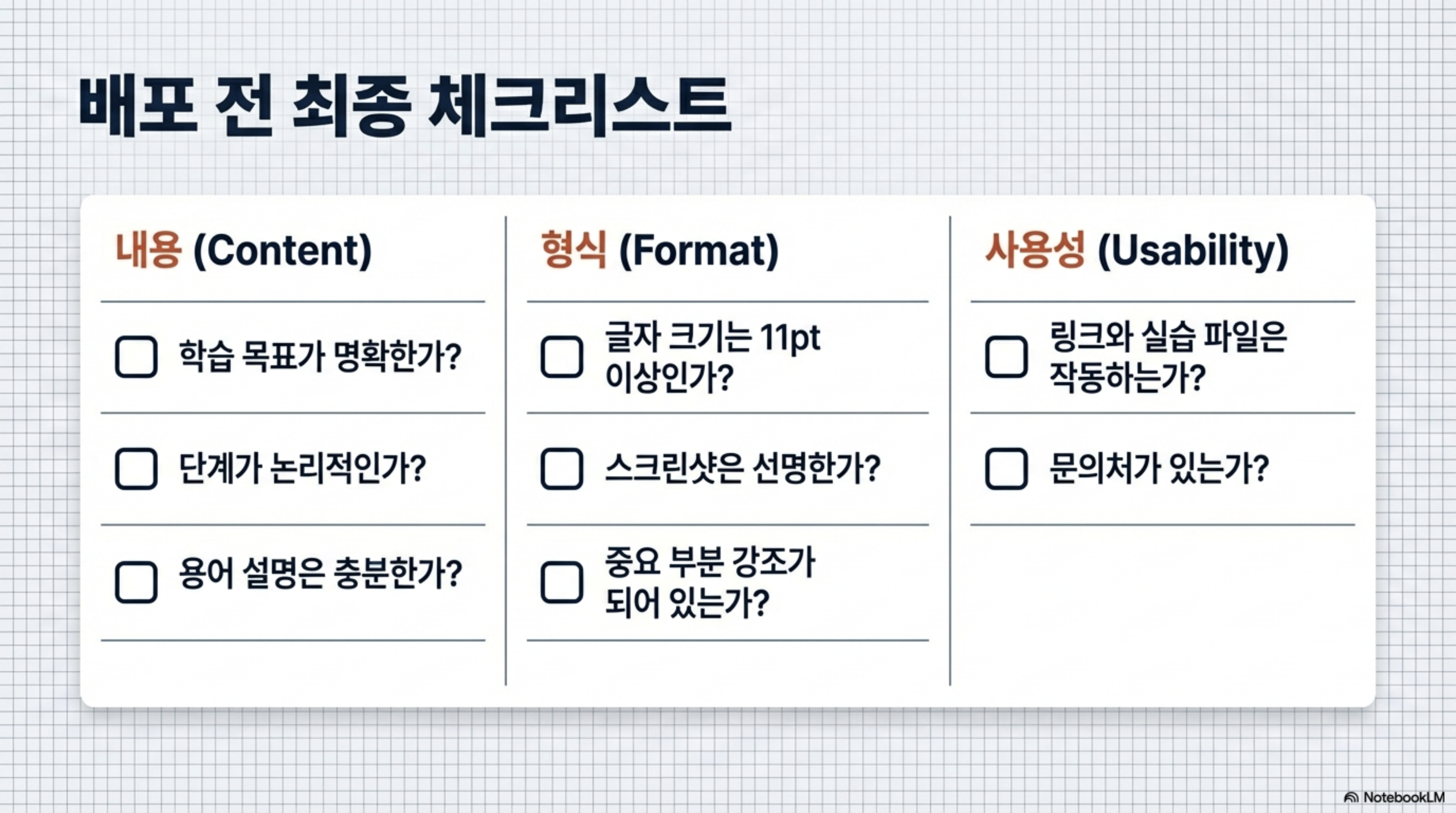 교육 자료를 만들 때 가장 중요한 것은 “이 자료를 보는 사람이 혼자서도 할 수 있을까?”라는 질문을 끊임없이 던지는 것입니다. 이 질문에 자신 있게 “예”라고 답할 수 있을 때, 당신의 교육 자료는 진정한 선생님이 될 것입니다.