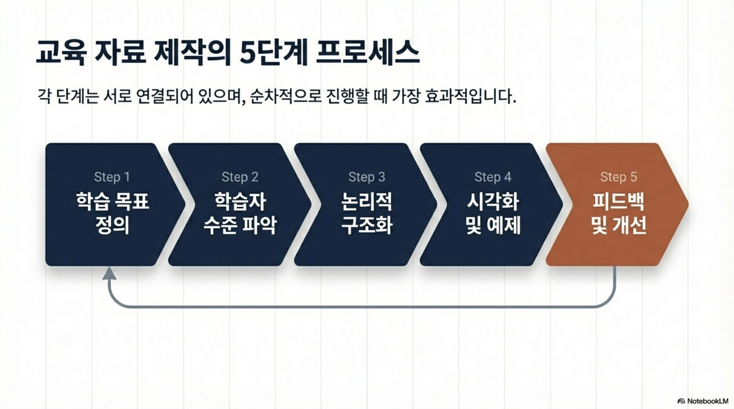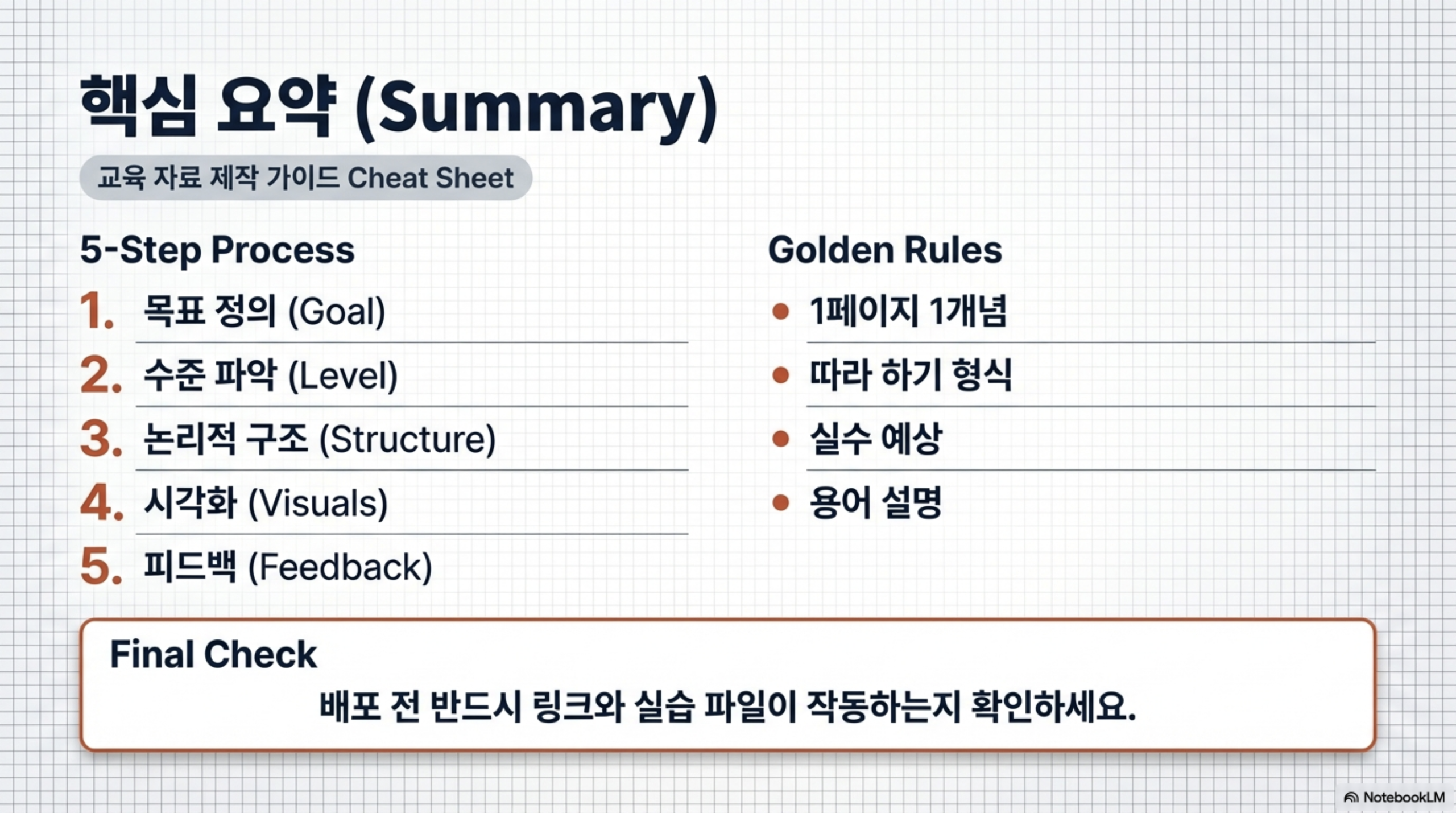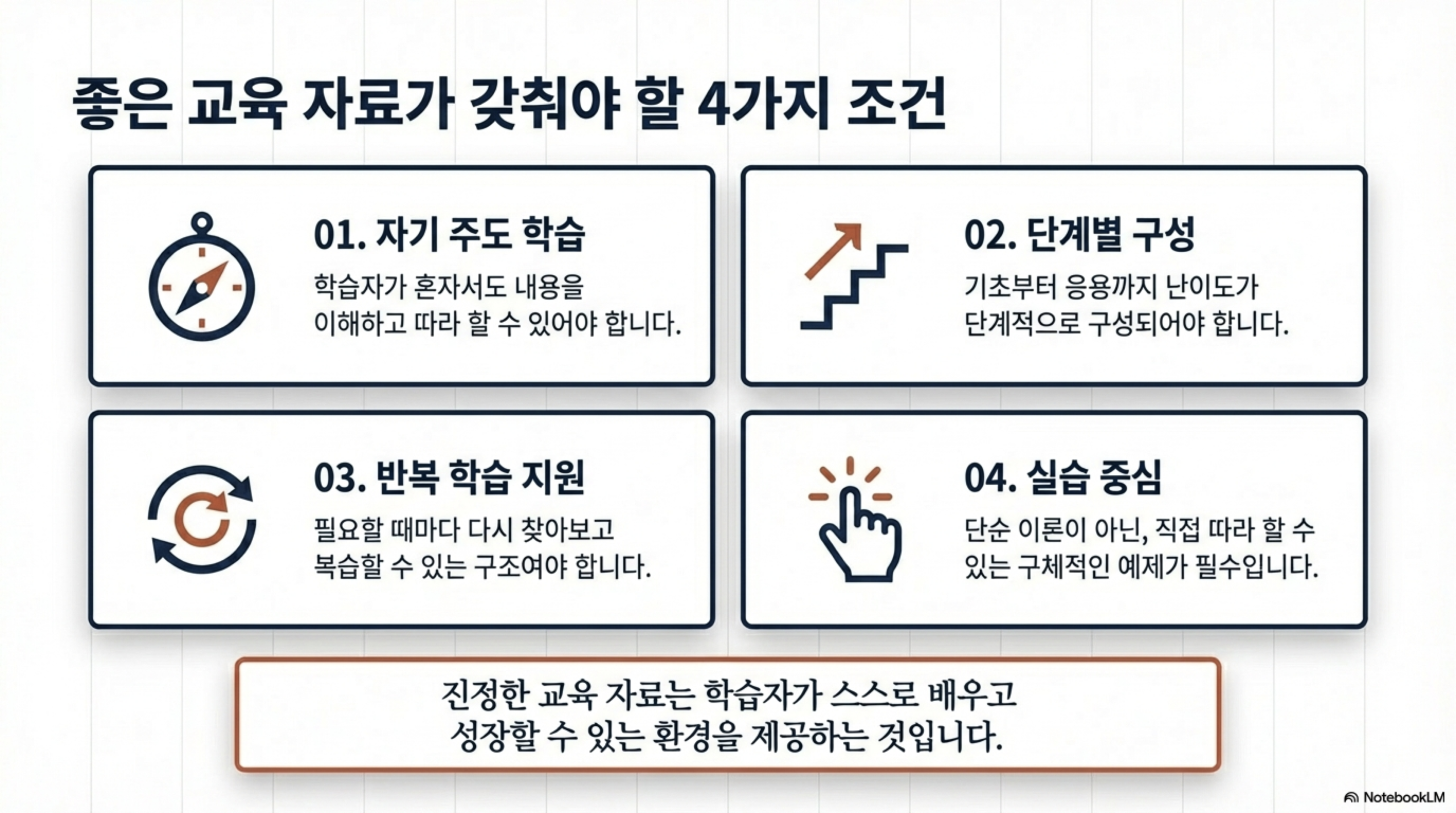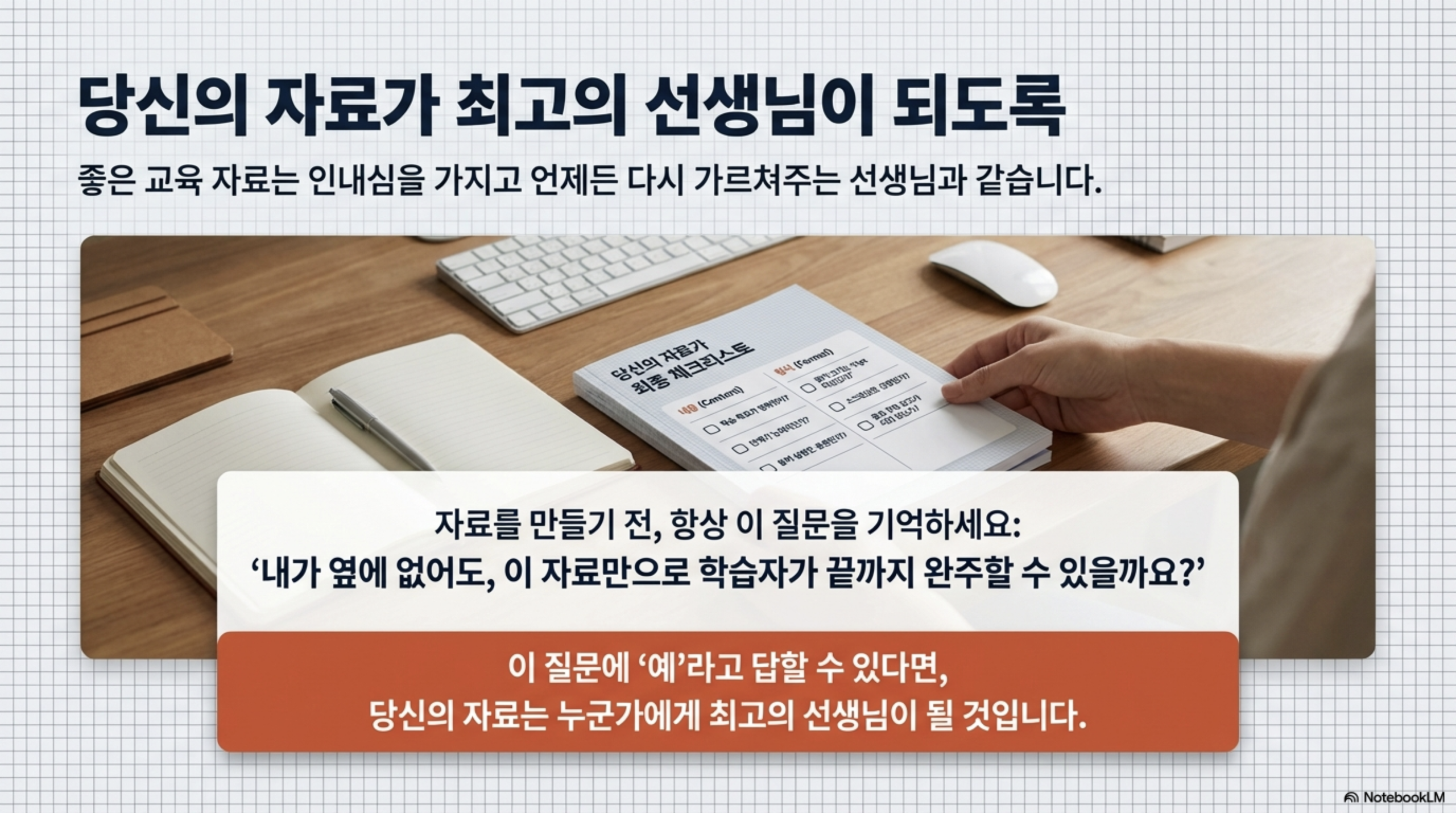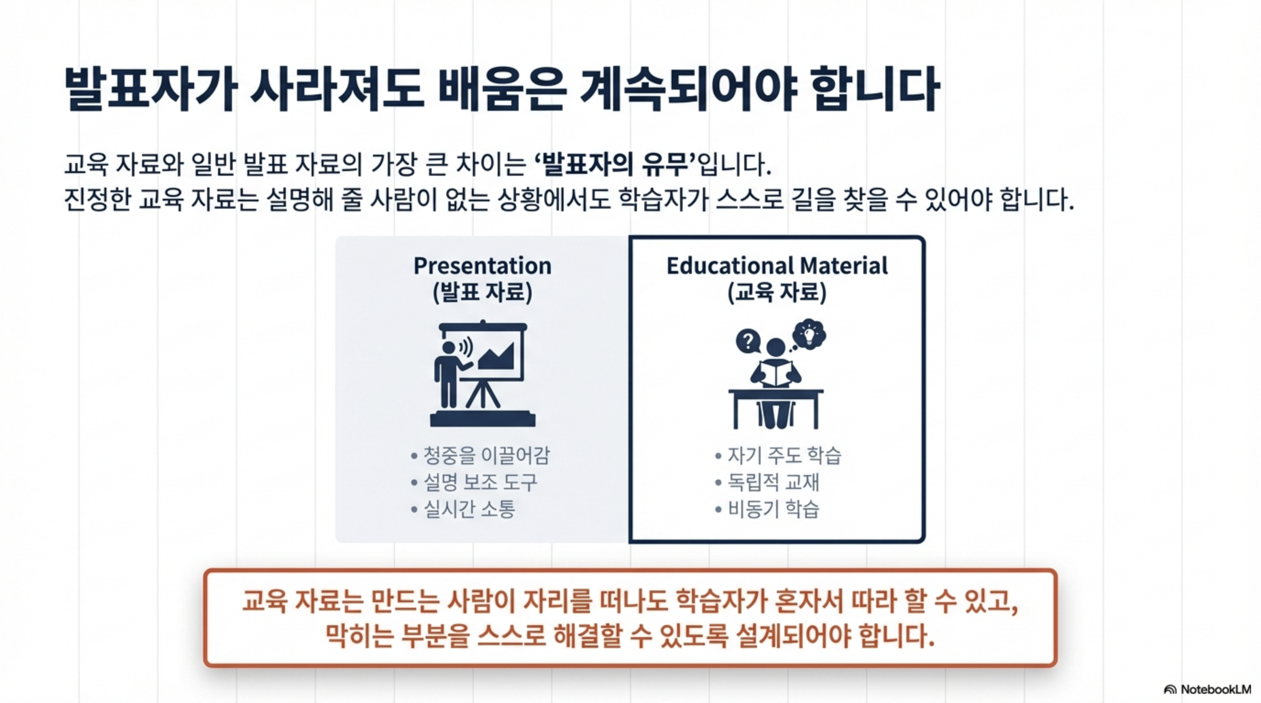 좋은 교육 자료는 단순한 문서가 아니라, 학습자 곁에서 인내심을 가지고 가르치는 선생님과 같습니다. 발표자가 떠난 후에도, 시간이 지난 후에도, 학습자가 언제든 다시 찾아와 배울 수 있는 믿음직한 안내자가 되어야 합니다.