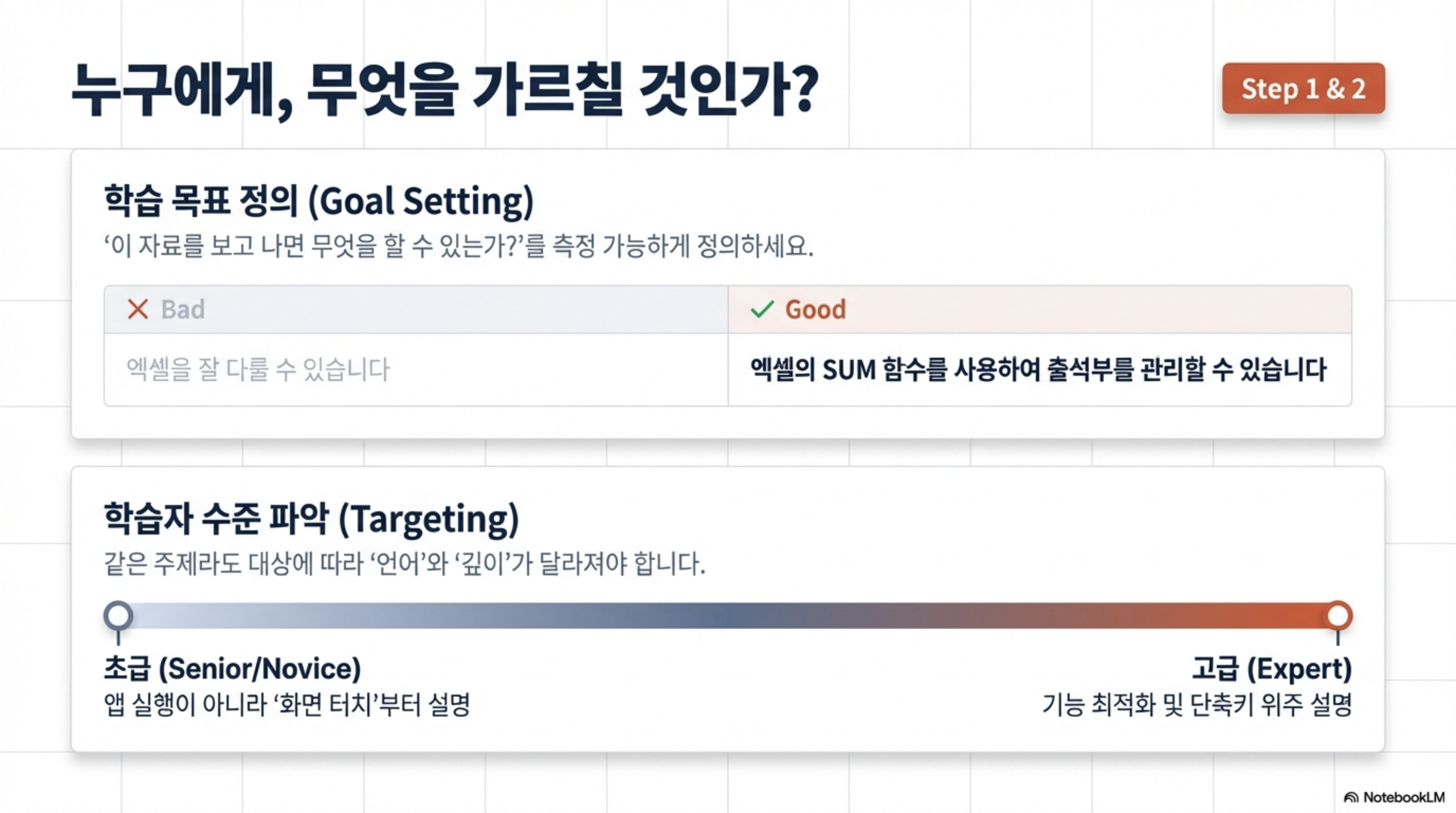 같은 주제라도 학습자의 수준에 따라 내용 구성이 완전히 달라집니다. 대상자를 명확히 정의하고, 그들의 현재 수준과 필요를 파악해야 합니다.