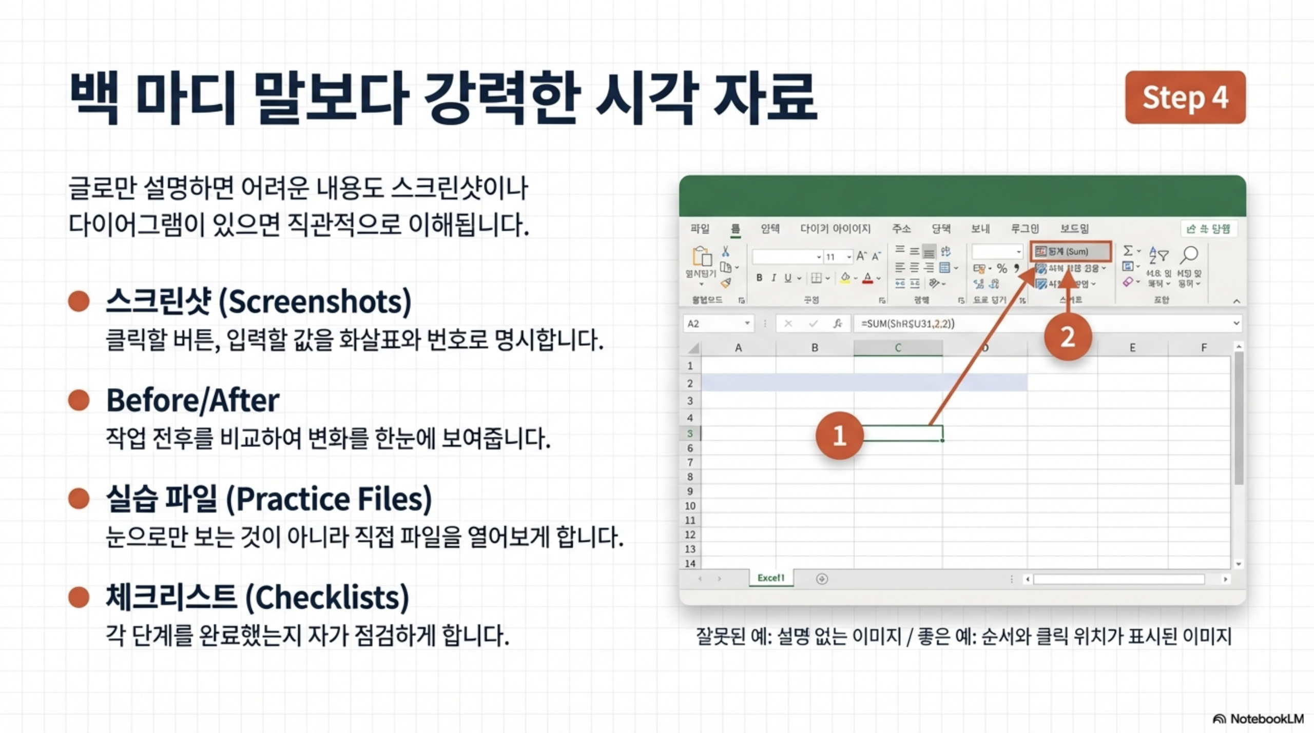 해결책: 각 스크린샷에 “무엇을 하는 단계인지”, “왜 이 작업이 필요한지”를 함께 설명합니다.