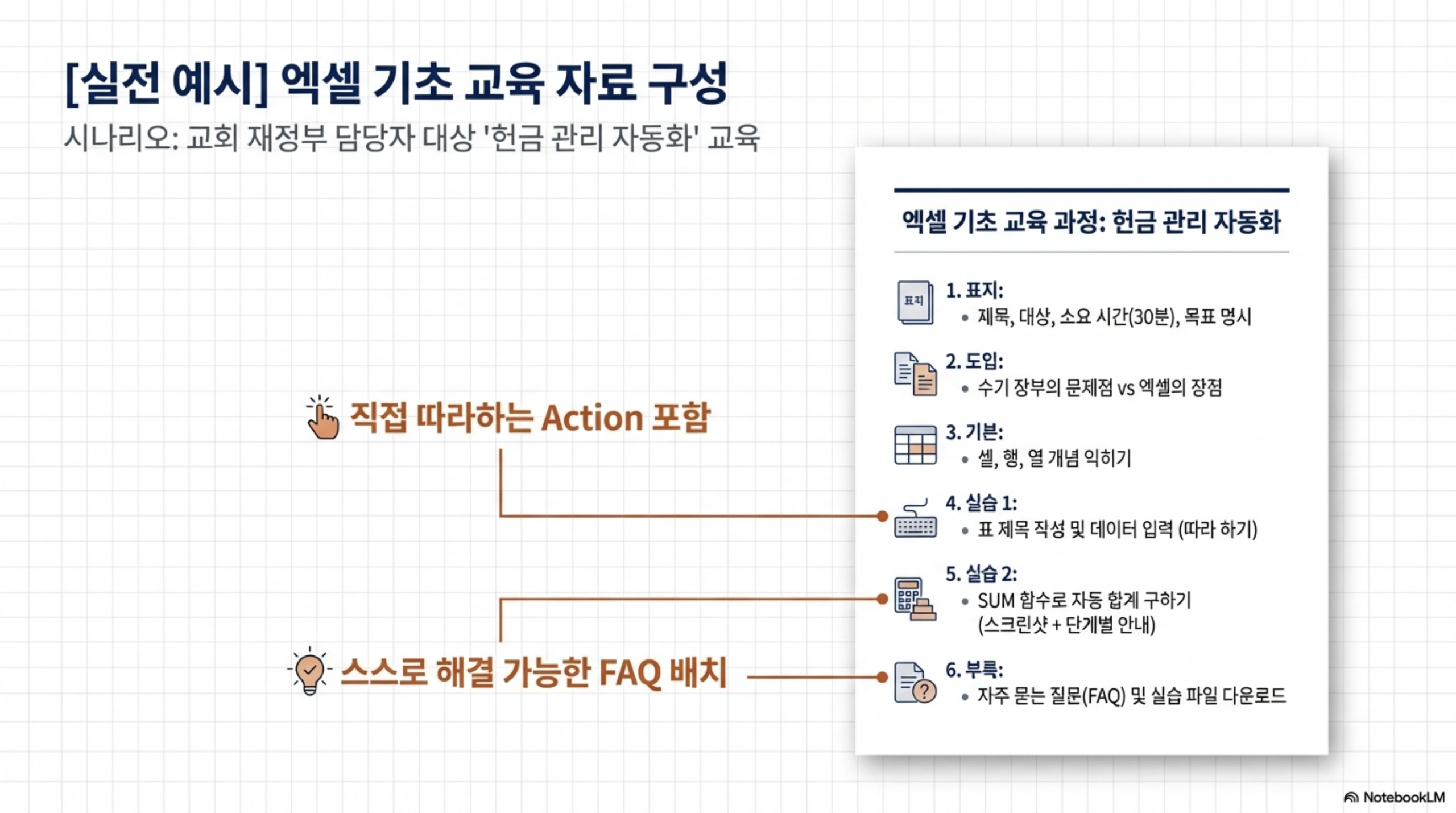 예를 들어, 교회에서 엑셀 기초 교육을 진행했다면, 교육 당일 참석하지 못한 분들도 자료만으로 학습할 수 있어야 하며, 참석한 분들도 나중에 다시 복습할 수 있어야 합니다.