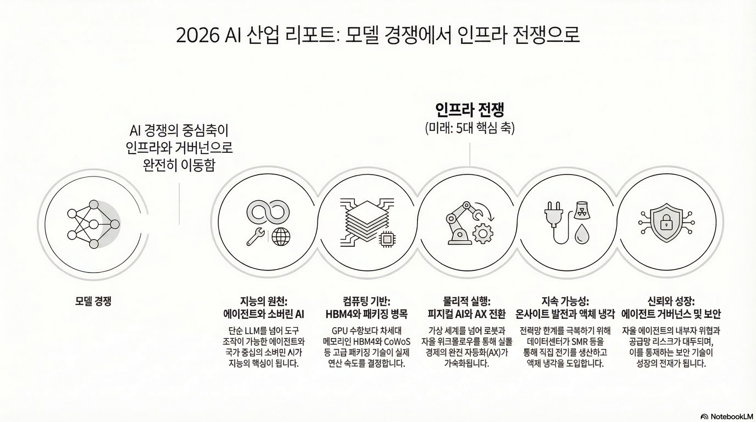 이 축은 컴퓨팅 기반(축 2)과 밀접하지만, 단순한 칩 생산을 넘어 “어느 국가에, 어떤 형태로, 어느 정도의 패키징·메모리·광모듈 능력이 입지하느냐”라는 지정학적 문제로 발전하고 있습니다. 앞으로는 소버린 AI 논의에서 “자국 데이터센터” 뿐 아니라, “자국 패키징·자국 HBM·자국 광학 라인”까지 포함하는 제조·패키징 주권이 핵심 전략 변수로 떠오를 가능성이 큽니다.