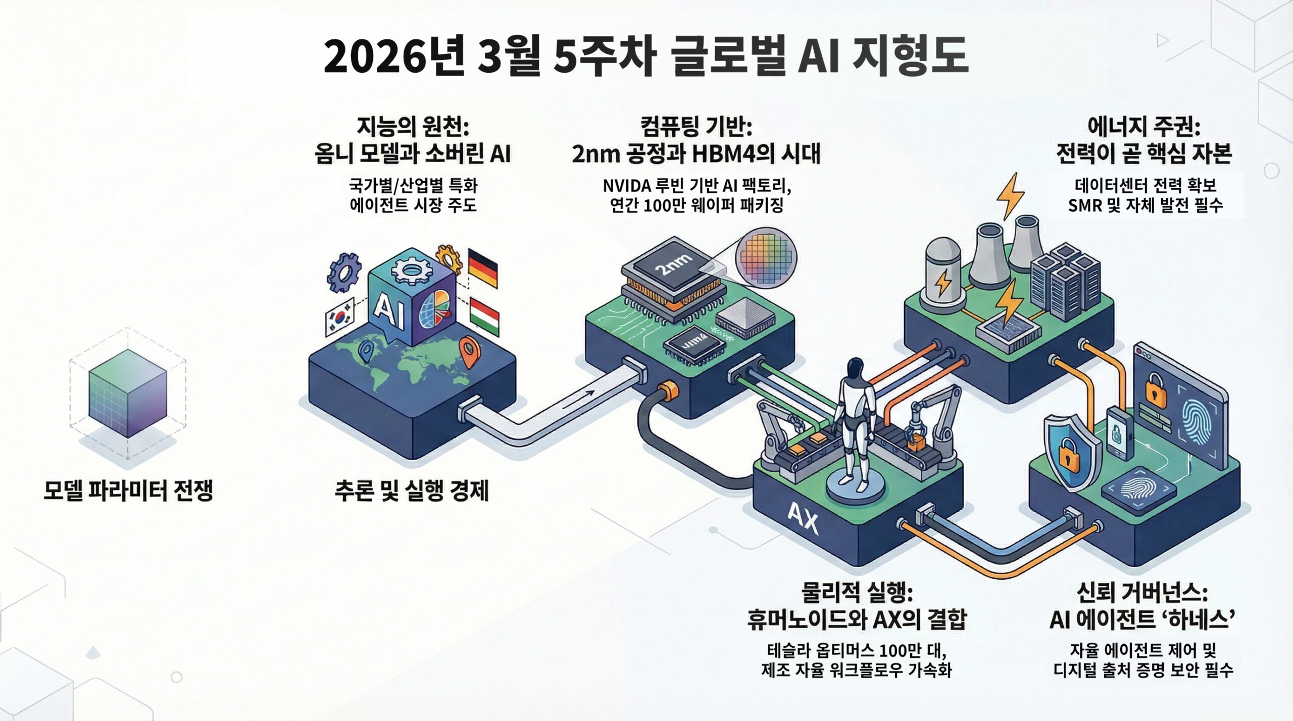 아래 내용은 2026년 3월 30일 기준, 최근 15일 이내 공개된 공식 발표와 업계 리포트를 바탕으로 정리한 5대 축 중심의 산업 지형도입니다. 특히 이번 주는 추론 경제(대규모 학습보다 실사용 추론이 더 중요해지는 구조), 물리적 AI(로봇·현장 자동화), 에너지 주권(전력과 냉각의 확보), 에이전트 거버넌스(자율 AI 통제)가 동시에 부상하고 있다는 점이 핵심입니다.