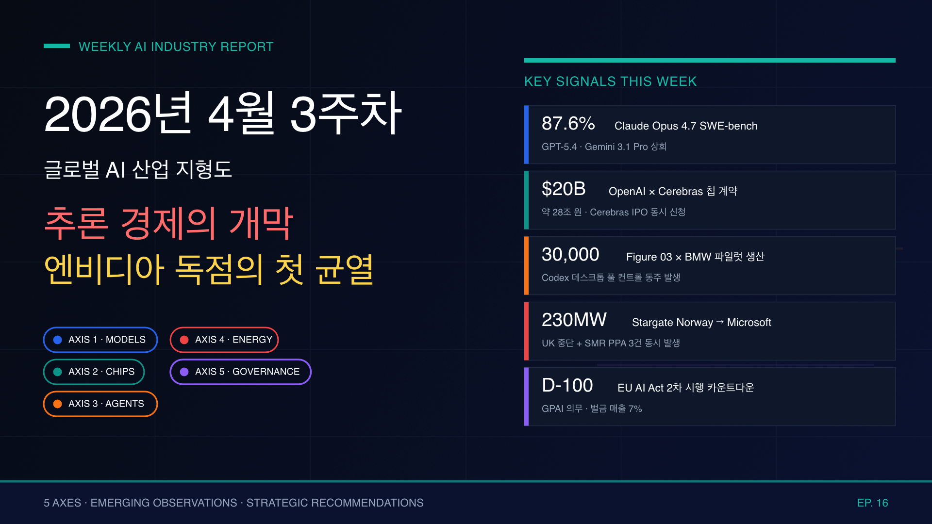 OpenAI–Cerebras 200억 달러 칩 계약 + Cerebras IPO 신청 (4월 17~18일) — Cerebras가 4월 17일 OpenAI와 $20B(약 28조 원) 규모 웨이퍼-스케일 칩 공급 계약을 발표하고 같은 날 NASDAQ 상장 신청. 목표 가치 $35B(약 49조 원). 추론 전용 가속기 시장이 NVIDIA 단독에서 확실한 2~3극 구조로 이동. (출처: TechCrunch, PANews)