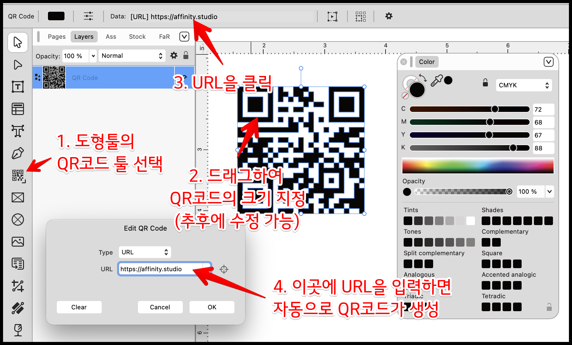 - QR 코드 생성: 캔버스에서 클릭 + 드래그해서 QR 코드의 크기를 정해 생성합니다.