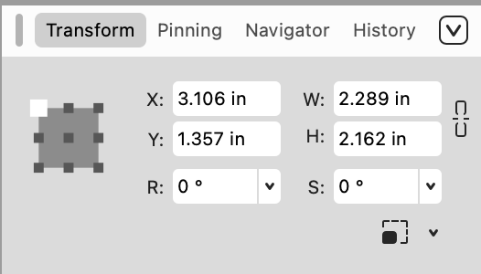 - 화면 우측 하단에 배치되어 있으며, 도형의 정확한 X/Y 좌표 위치, 너비(W)와 높이(H), 회전(Rotation), 기울기(Shear) 값을 소수점 단위의 정밀한 수치로 제어할 때 사용합니다.