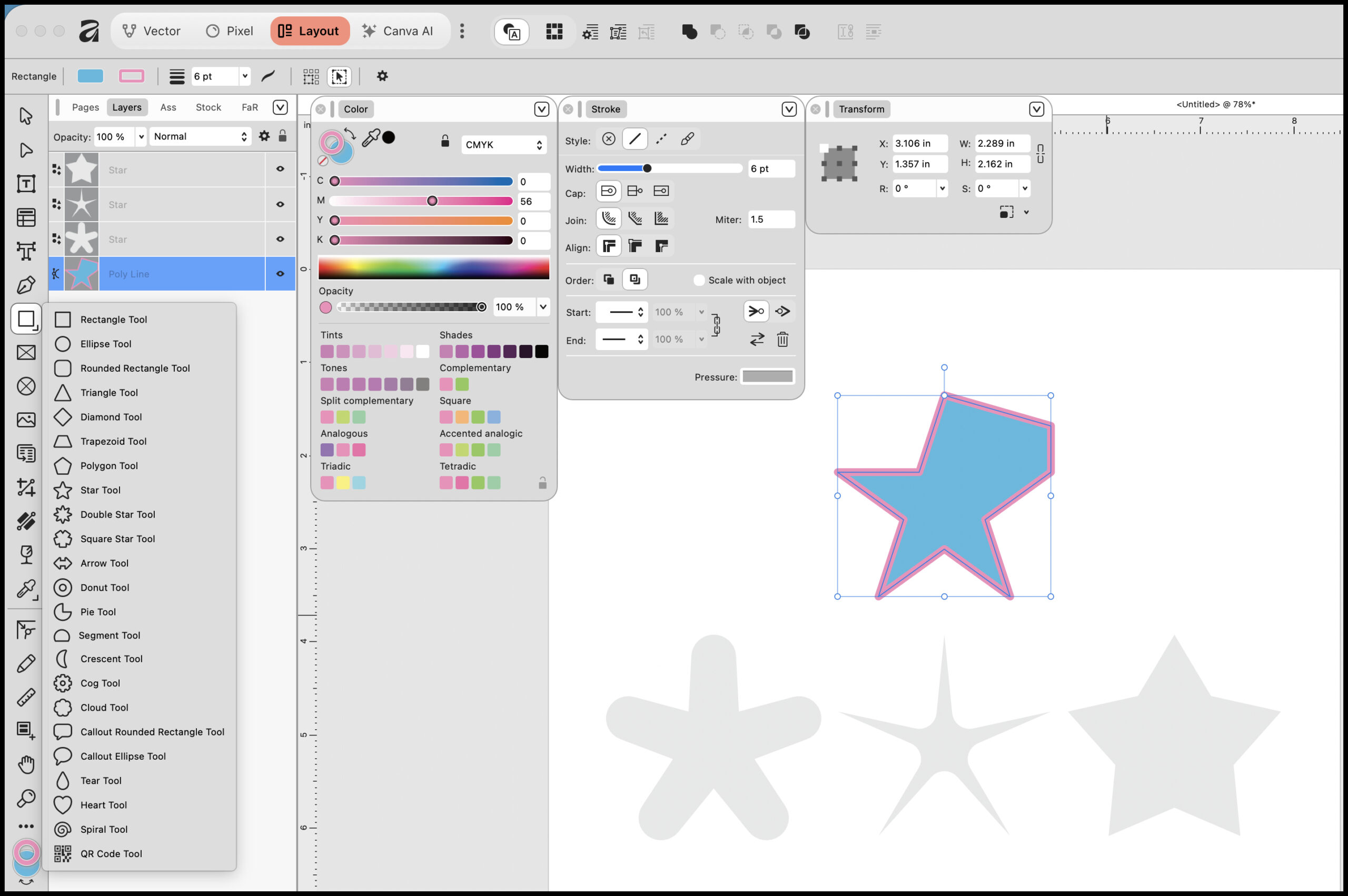 - Affinity의 도형들은 단순히 한 번 그려지고 끝나는 것이 아니라, 생성 후에도 실시간으로 형태적 특성을 변형할 수 있는 ‘라이브 쉐이프(Live Shapes)’ 속성을 가집니다.