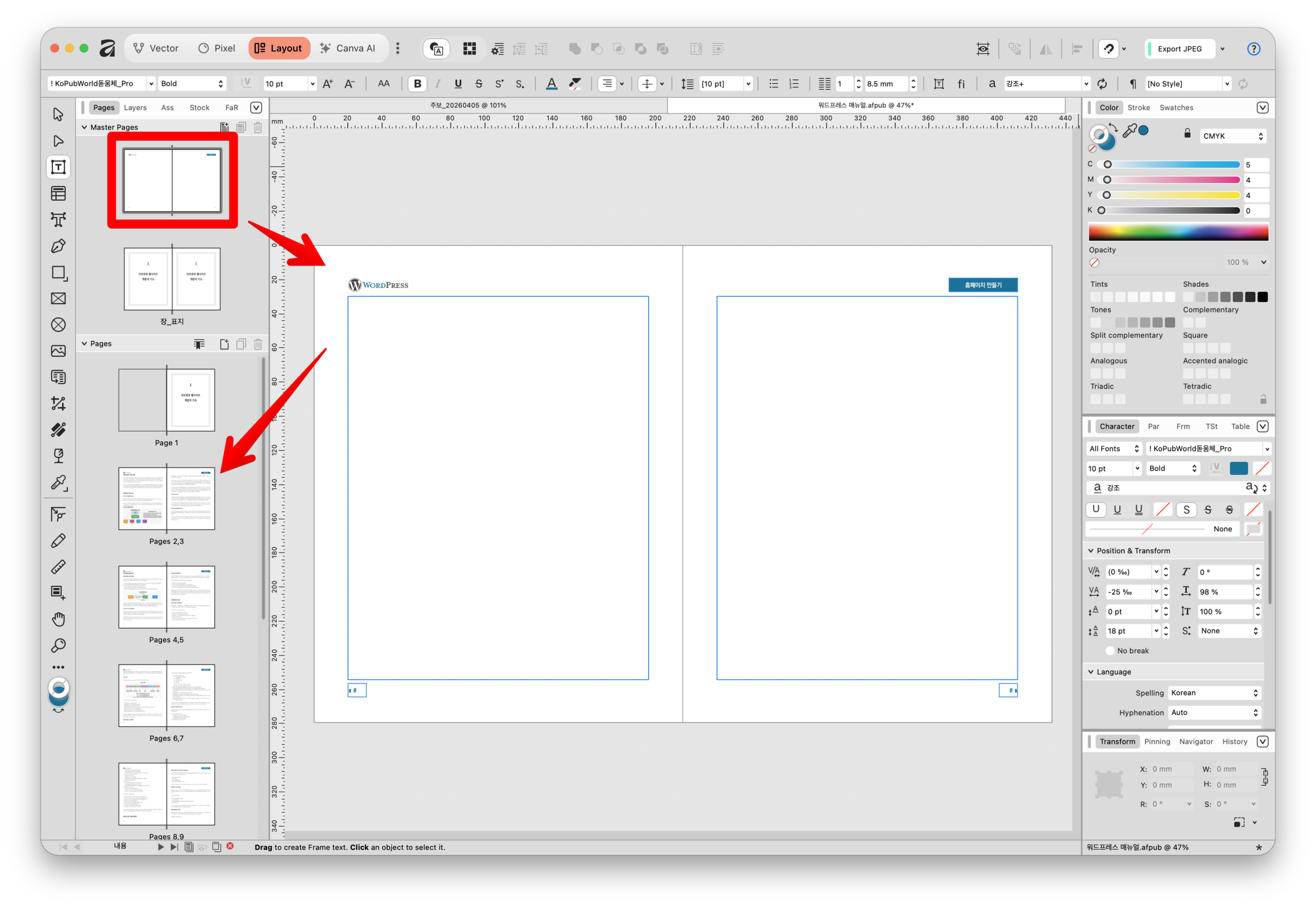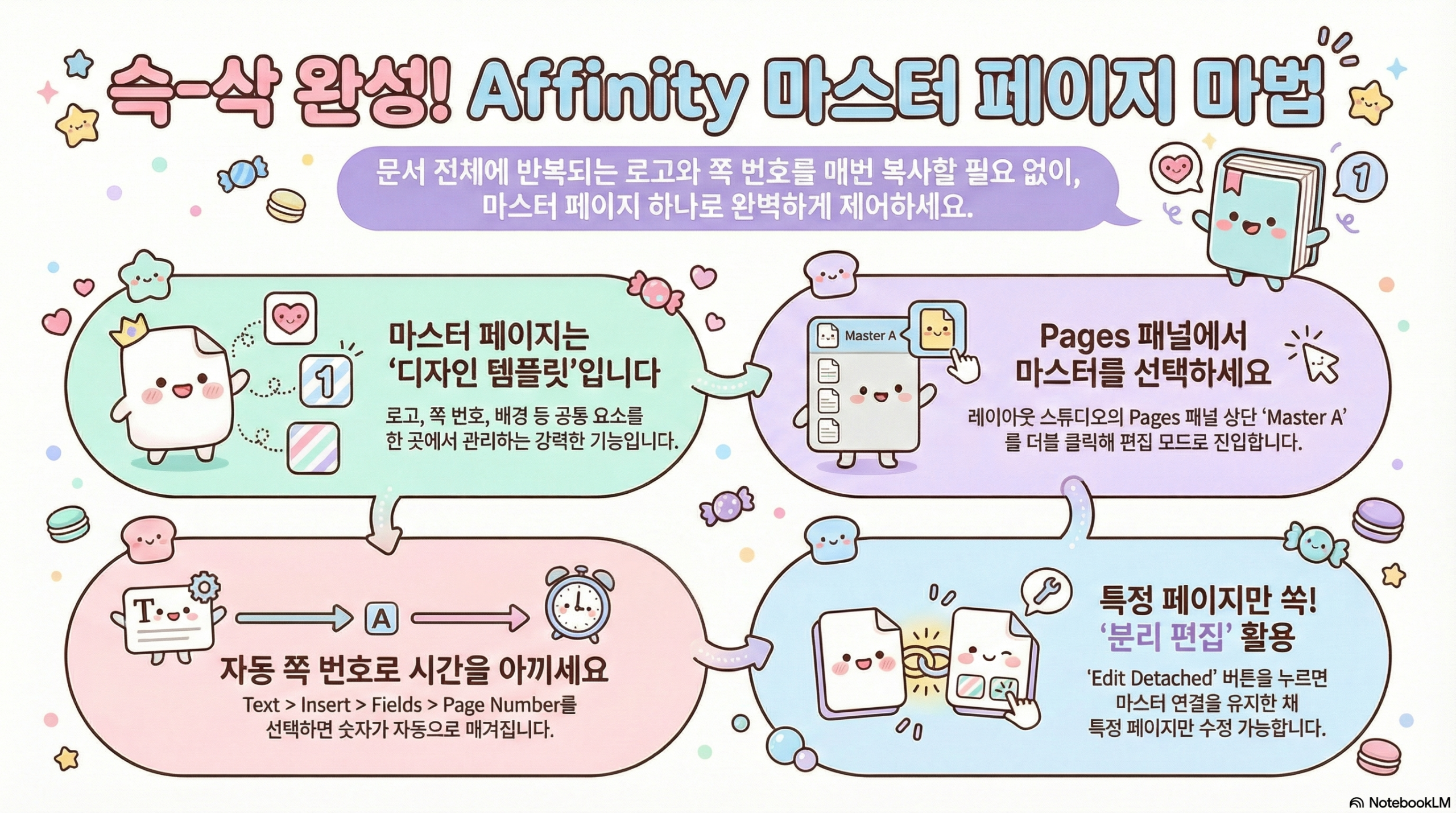 Affinity의 레이아웃 스튜디오(Layout Studio)에서 제공하는 **마스터 페이지(Master Pages)**는 문서의 여러 페이지에 반복적으로 들어가는 디자인 요소를 한 번에 관리할 수 있게 해주는 강력한 ‘템플릿’ 기능입니다. 초보자도 쉽게 이해할 수 있도록 단계별로 설명해 드립니다.