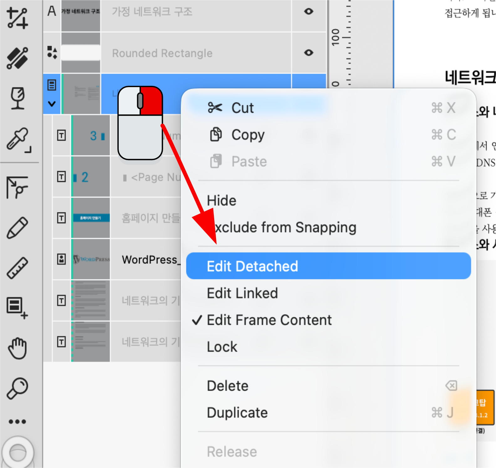 - 화면 상단의 이동 도구(Move Tool) 컨텍스트 툴바를 보면 **’분리 편집(Edit Detached)’**이라는 버튼이 있습니다. 이 버튼을 클릭합니다.