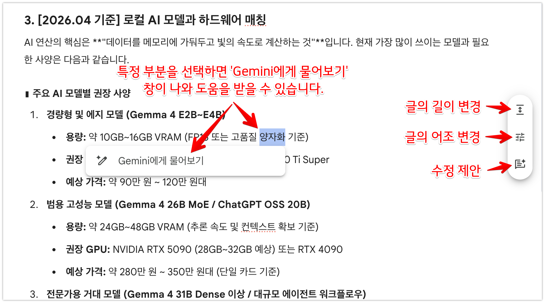 - 길이 변경: 선택한 텍스트에 구체적인 설명을 더해 내용을 길게 확장하거나, 반대로 핵심만 추려 간결하게 요약할 수 있습니다.